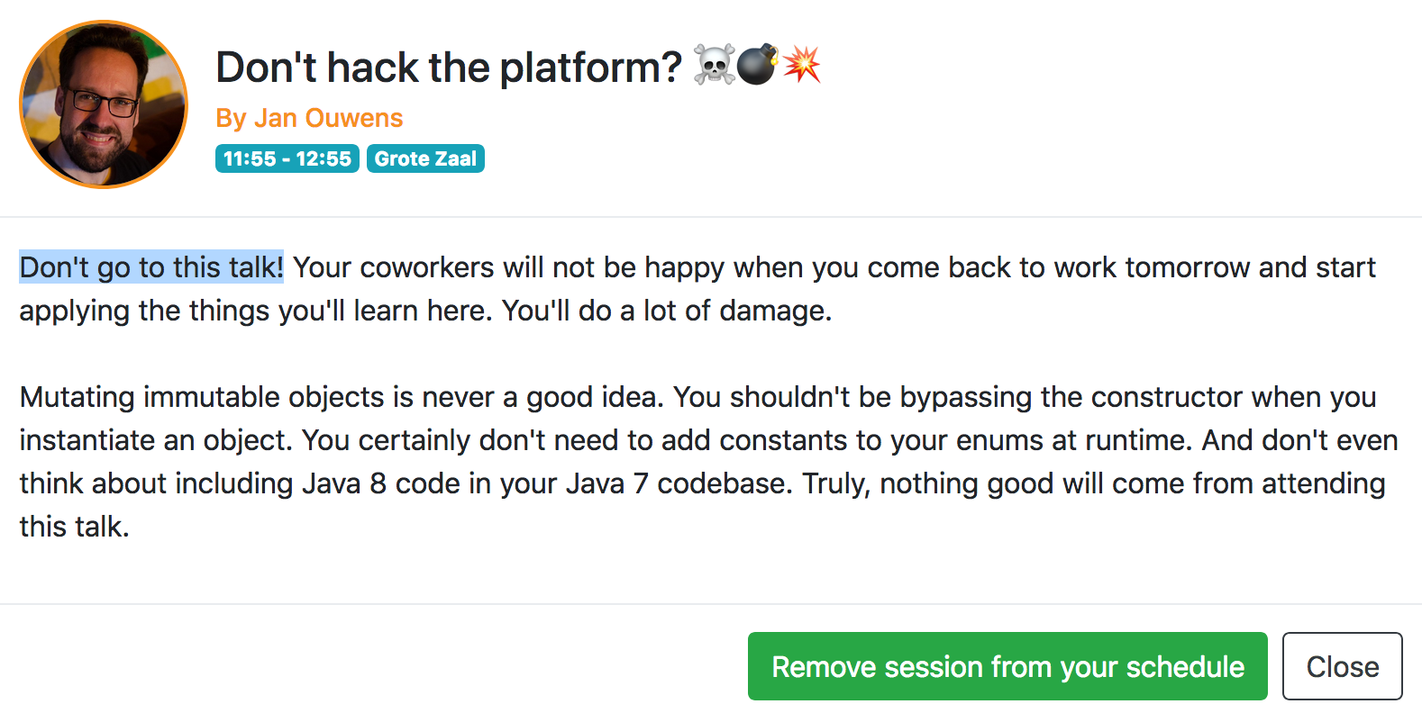 WARNING: Illegal reflective access by demos.reflection.CallOfTheVoid (file:/Users/jqno/w/personal/dont-hack-the-platform-talk/target/classes/) to constructor java.lang.Void()